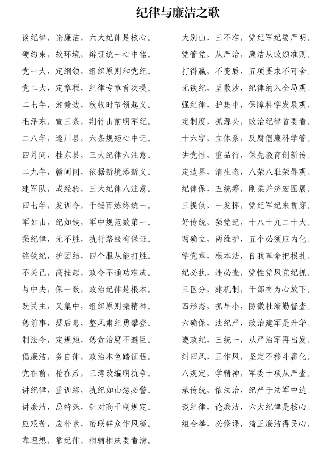 作品简介:以纪律与廉洁为核心,以党史军史纪律建设历程为脉络,采用朗朗上口的歌谣体,开篇点题,首尾呼应。按时间线梳理一大立纲、三大纪律八项注意形成、新时代全面从严治党等关键节点,突出六大纪律、四个服从、纠治四风等核心要求。兼顾历史传承与时代要求,融纪律刚性与廉洁自律于一体,语言通俗、节奏明快,兼具教育性与传播性,旨在开展主题学习教育中,让师生党员在传唱中铭记铁纪、坚守廉洁,筑牢思想防线。