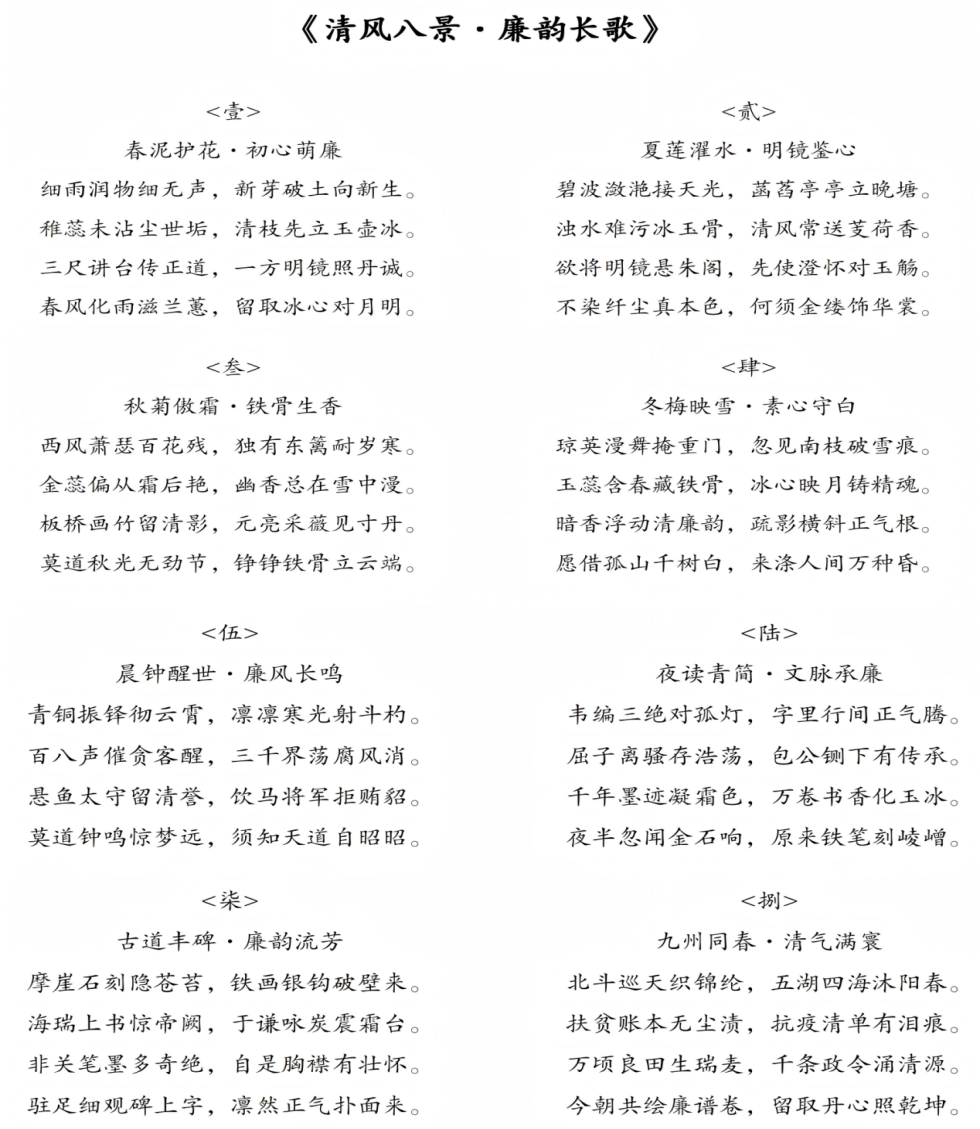 作品简介:以“廉”为主线,以四季景致、人文意象为载体,分为《春泥护花·初心萌廉》《夏莲濯水·明镜鉴心》等八章,以古典诗词形式,将春芽、夏莲、秋菊、冬梅的自然之美,与晨钟、夜读、古道、九州的人文底蕴相结合,融入廉洁初心、铁骨正气与家国情怀,既彰显了中华优秀传统文化的魅力,又传递了崇廉尚洁的价值理念,生动诠释了新时代廉洁文化的内涵。